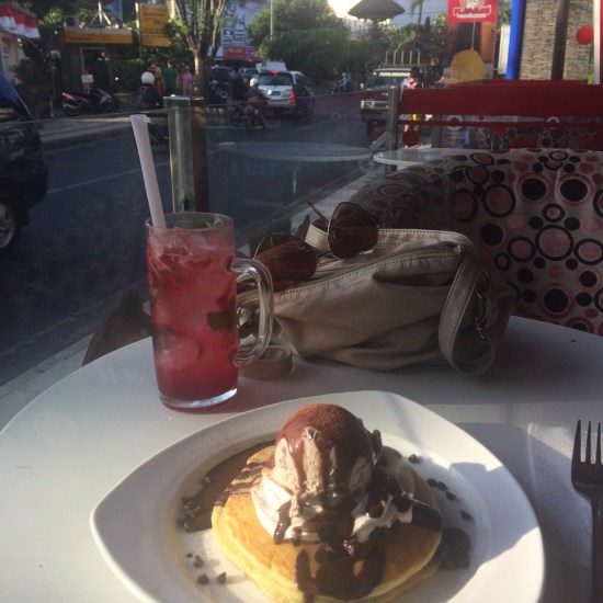 Checked into the beautiful hotel and headed for Kuta beach stopping by at the pancake place Flapjaks for one last round of fattening pancakes before leaving.