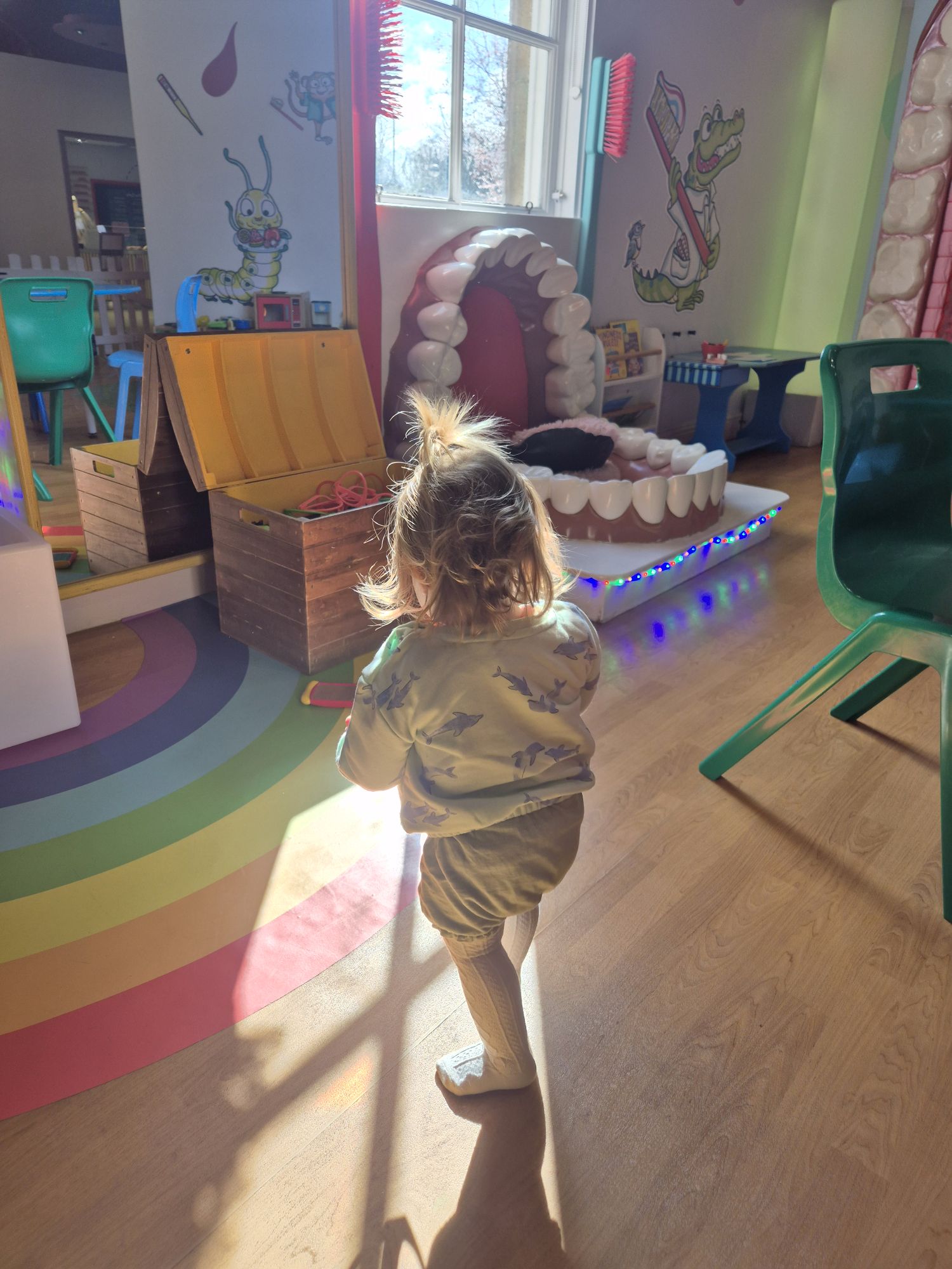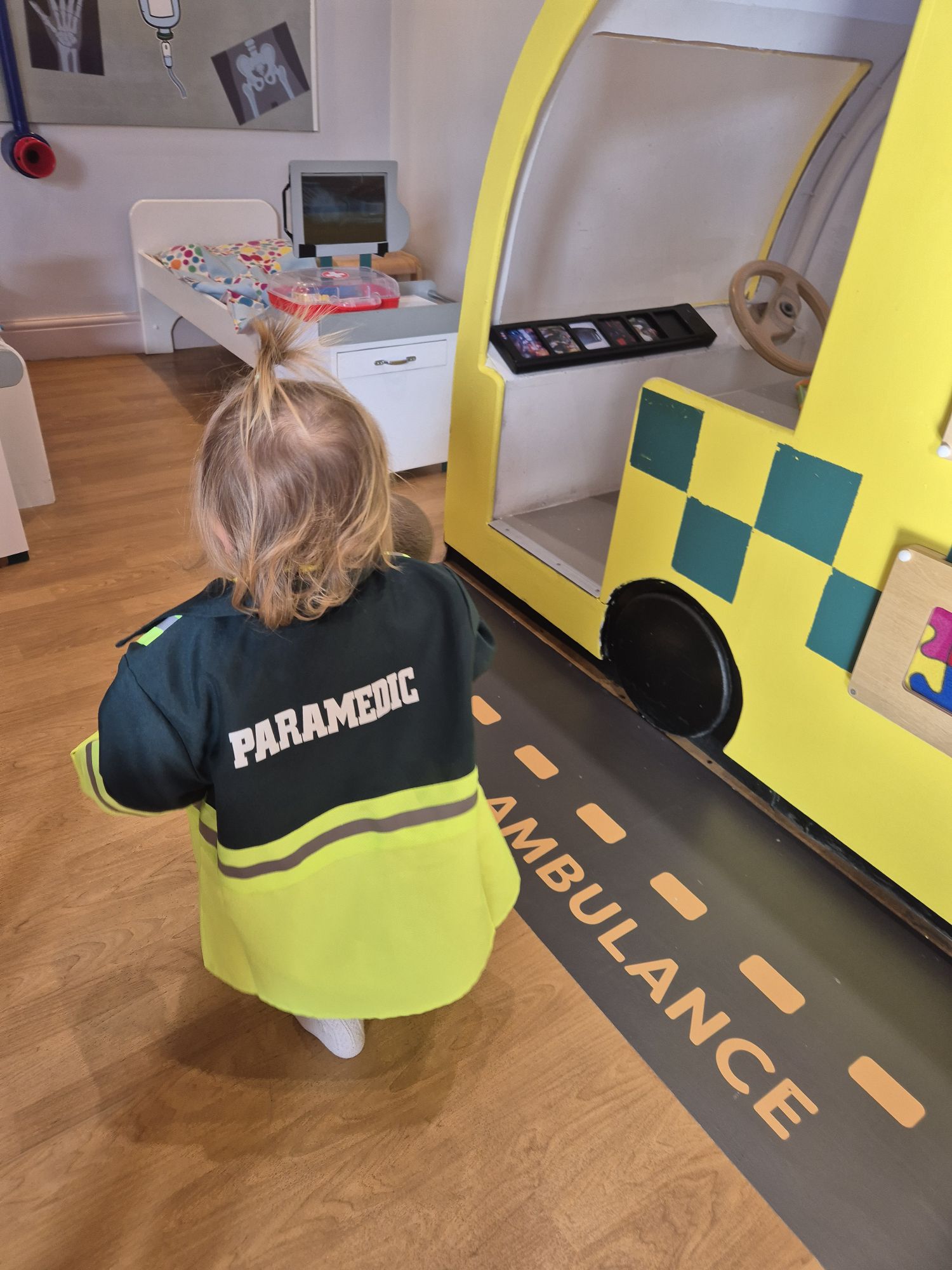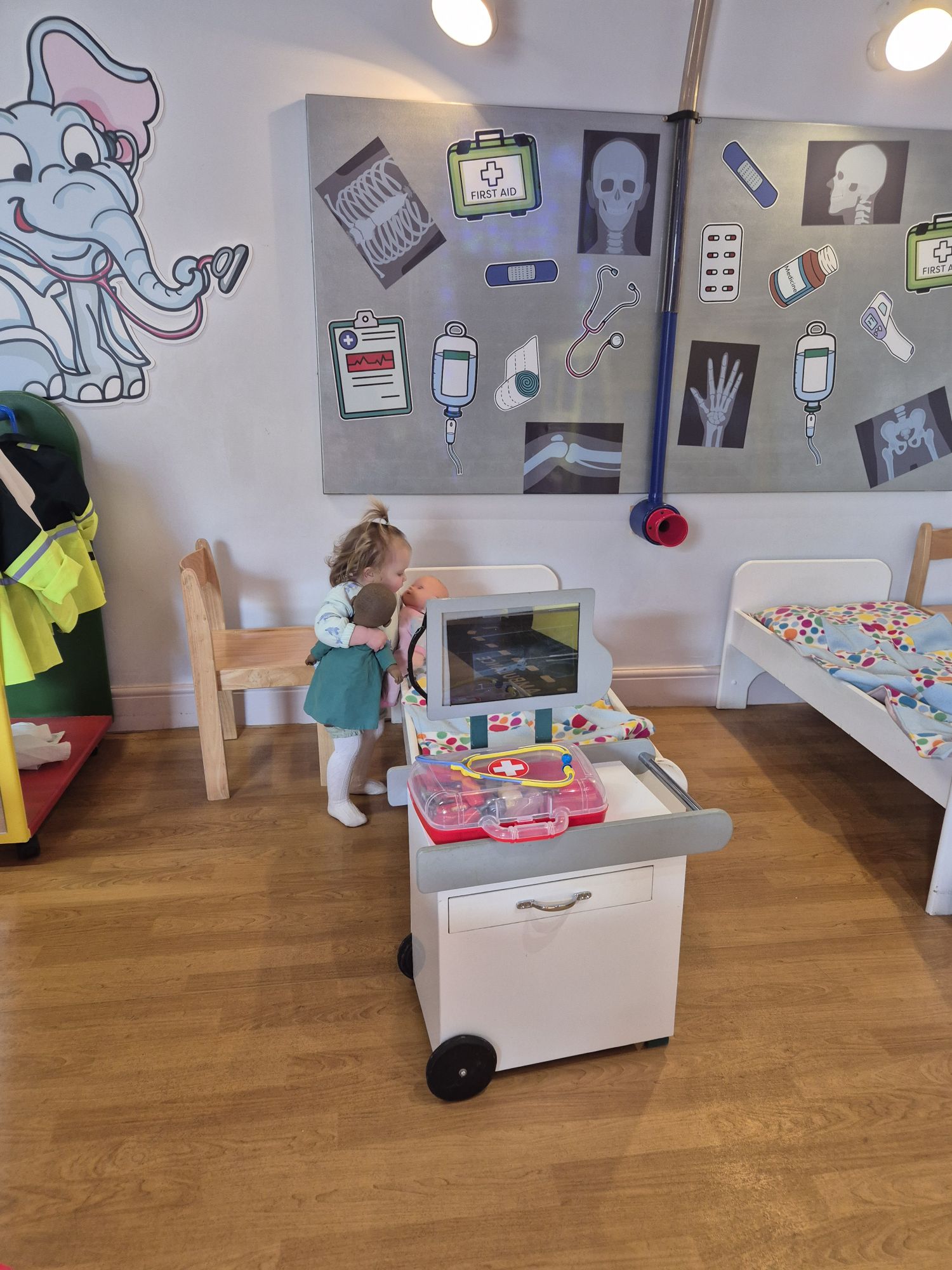 The play area is set up like a hospital with a reception, beds with patients (dolls) and even an ambulance to ride in! It has a kitchen with plenty of play food, tables and chairs and a giant mouth with teeth to brush! The whole play area is so unique I love it. There are even little outfits for the kids to play dress up with!