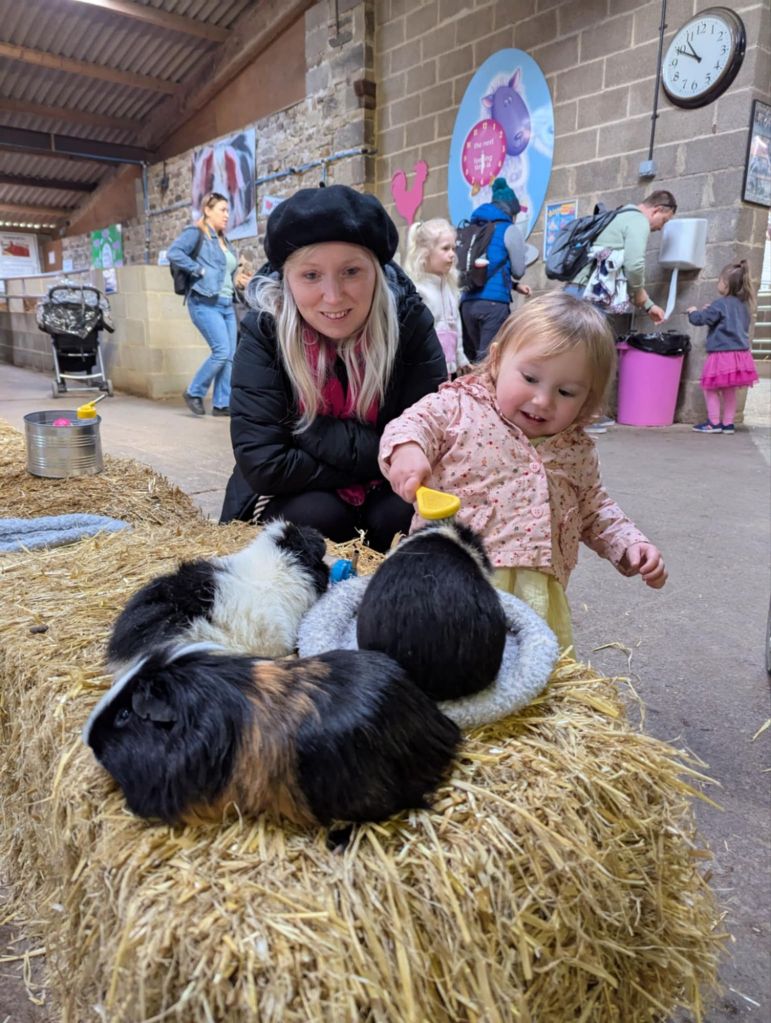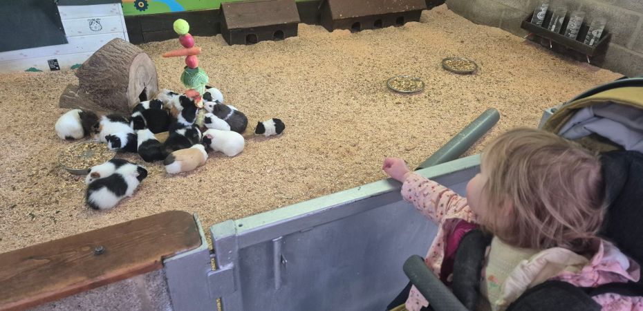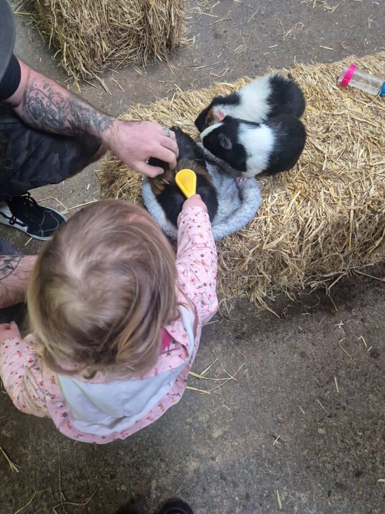 In the centre of the barn, there are hay bales you can sit on and stroke the Guinea pigs or have the Guinea pigs sit on your knee if you want to. My one year old daughter absolutely loved brushing the pigs. They are friendly and just the right size for a child to handle without being too fragile.