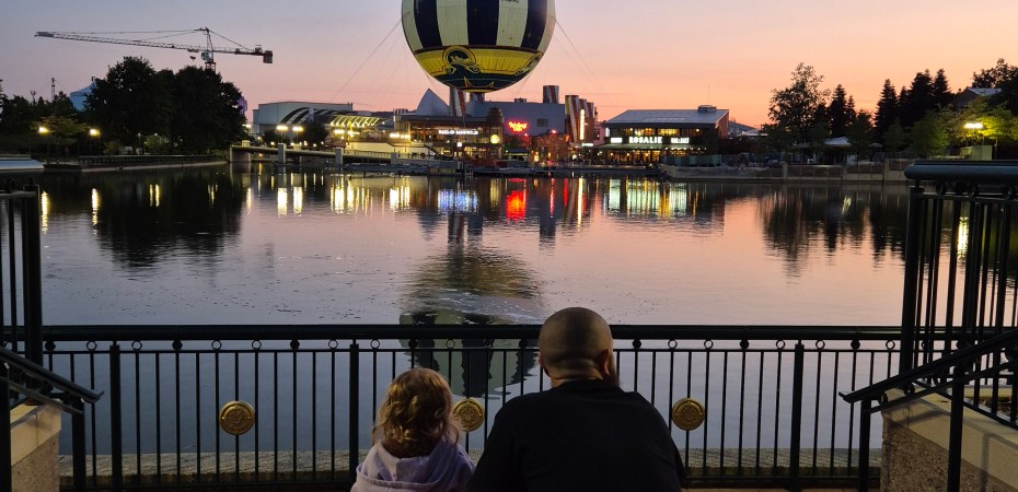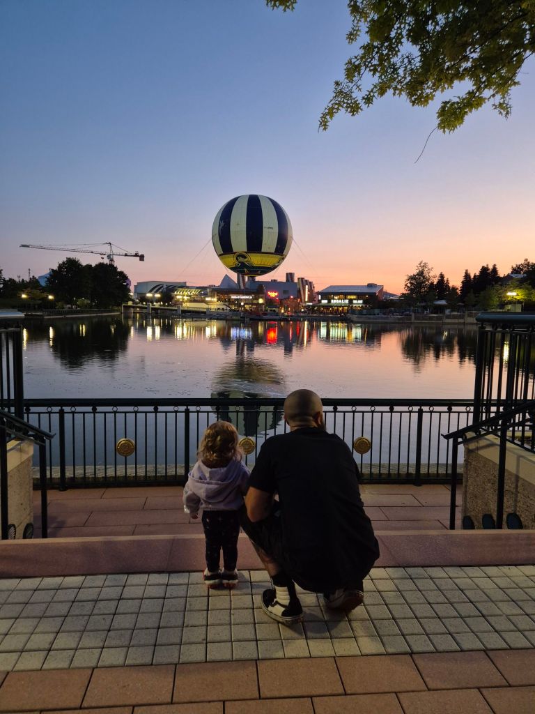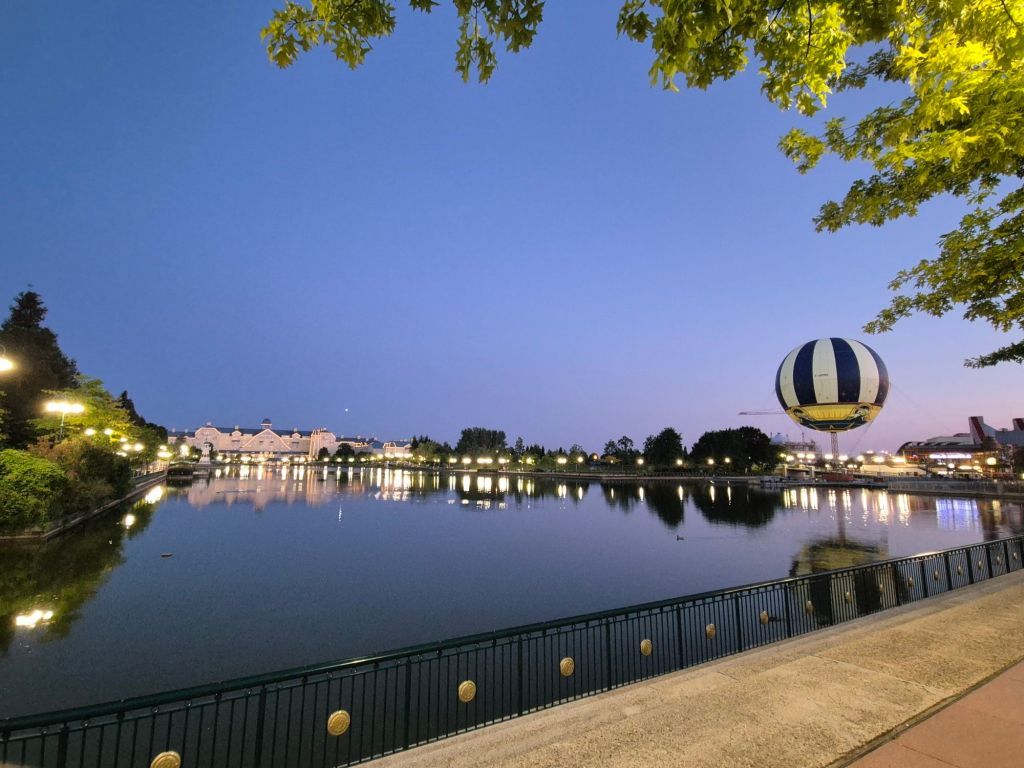 It was a beautiful evening with clear skies and temperatures warm enough to not require a jacket. We took a stroll through the trees by our hotel walkway and headed towards lake Disney. Here we were met with the sight of the iconic Disney Village Balloon.