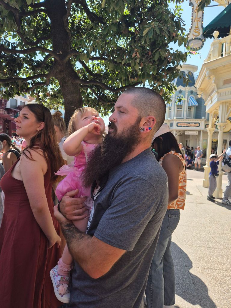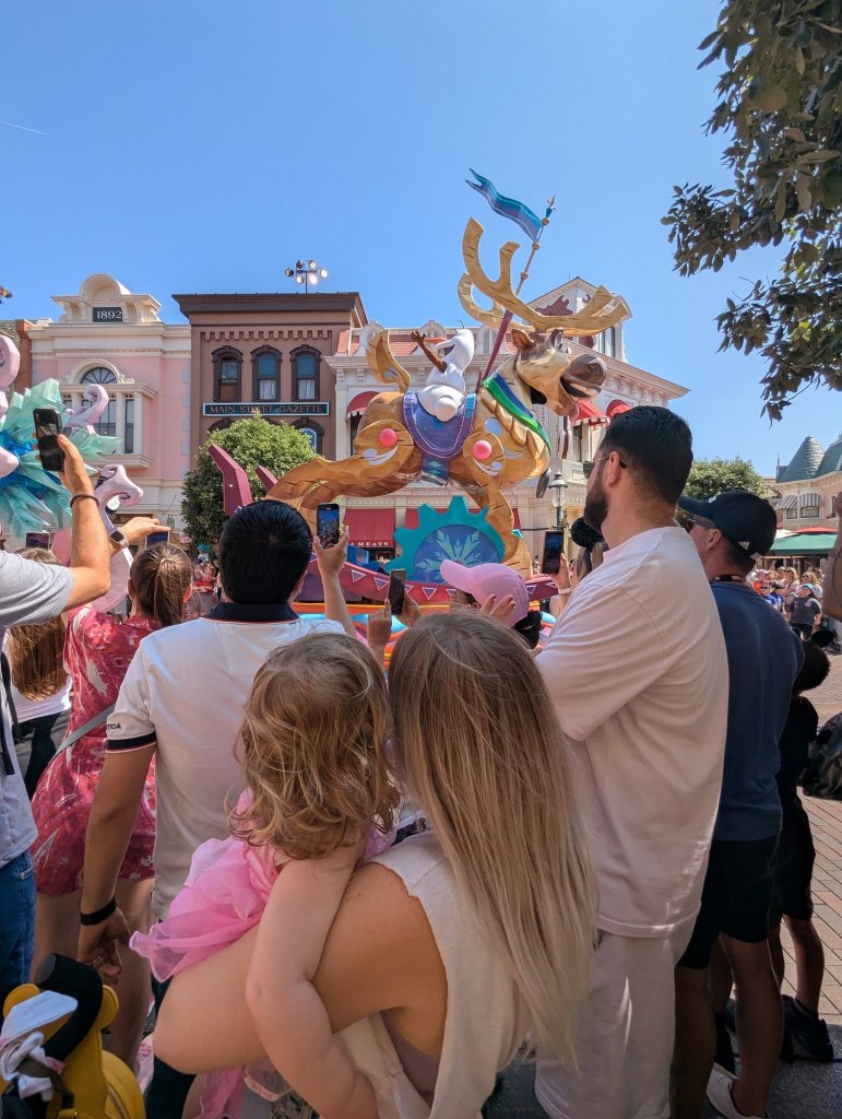 Hilda watched the parade from my husbands shoulders waving happily at all the characters.