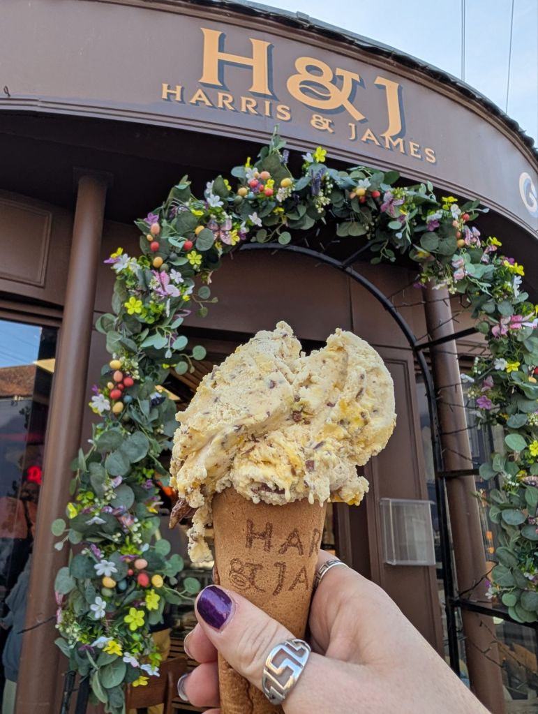Here we found H & J – Harris & James Chocolate Makers. Probably the largest dollop I’ve ever received for only one scoop! We enjoyed an interesting Jaffa Cake cone. Turns out it was gelato not ice cream but just the treat we were looking for.